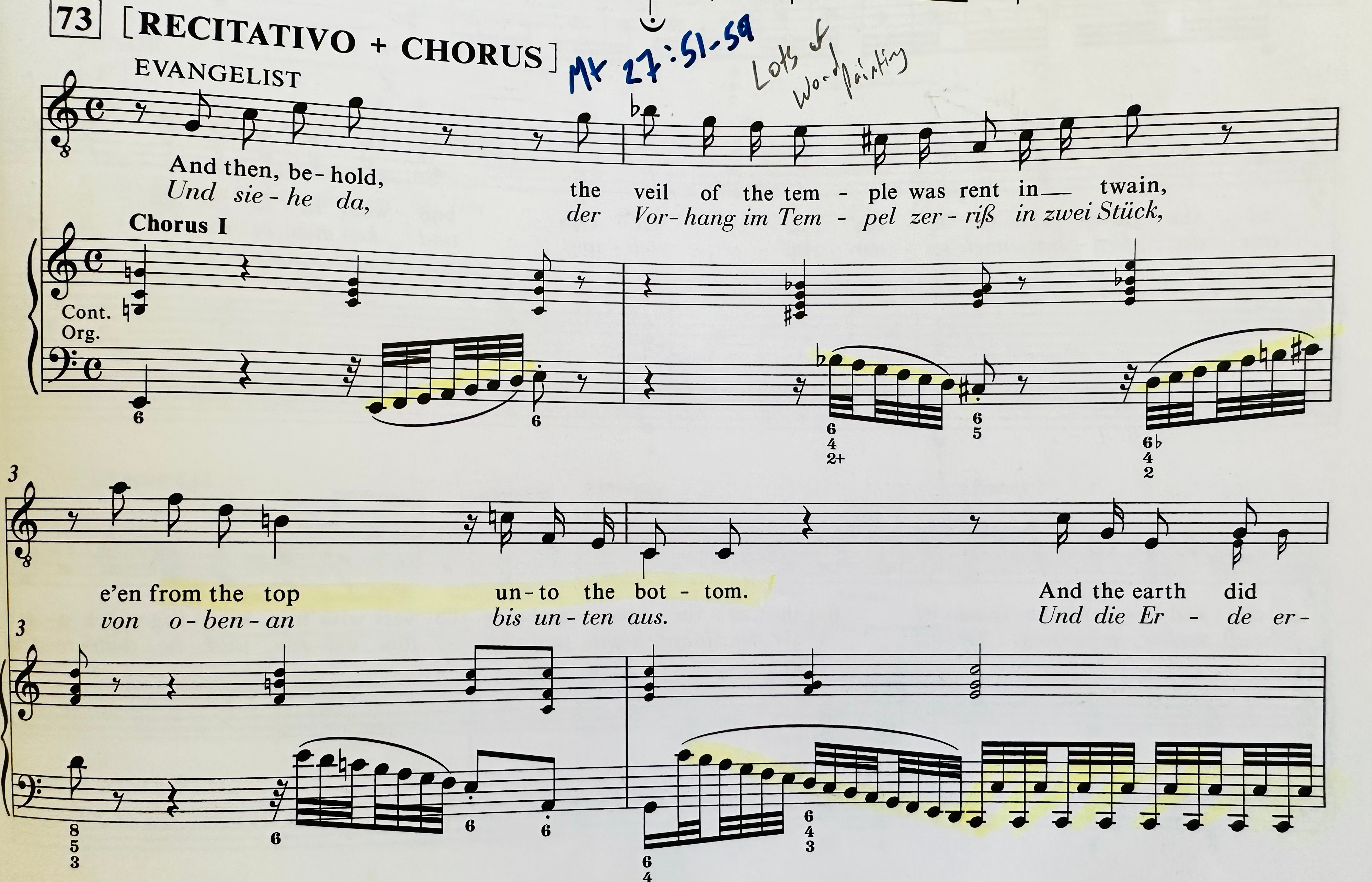 In the image below, you can see how Bach writes for the moment after Christ’s death in Movement 73 of the Saint Matthew Passion. The veil of the temple is torn in two by a two-octave run in the orchestra, followed by an earthquake in the low strings.